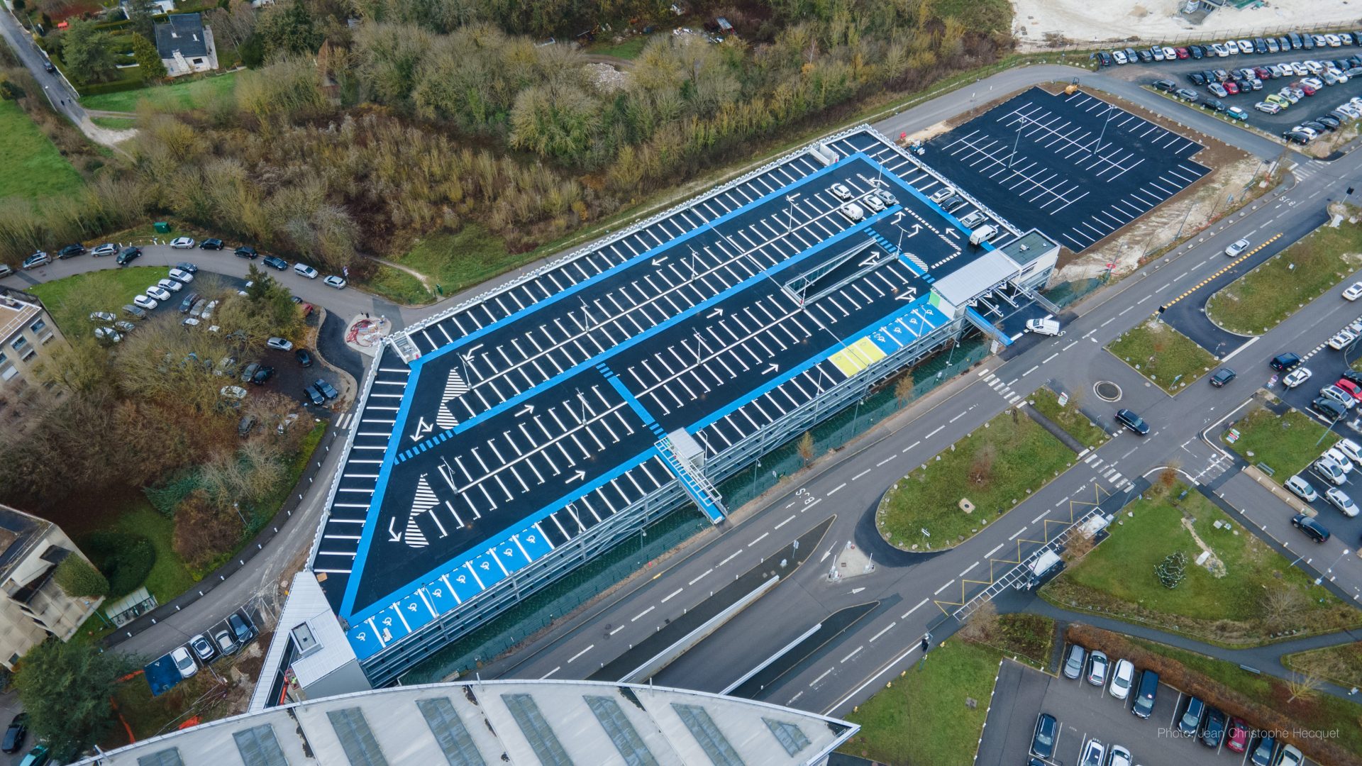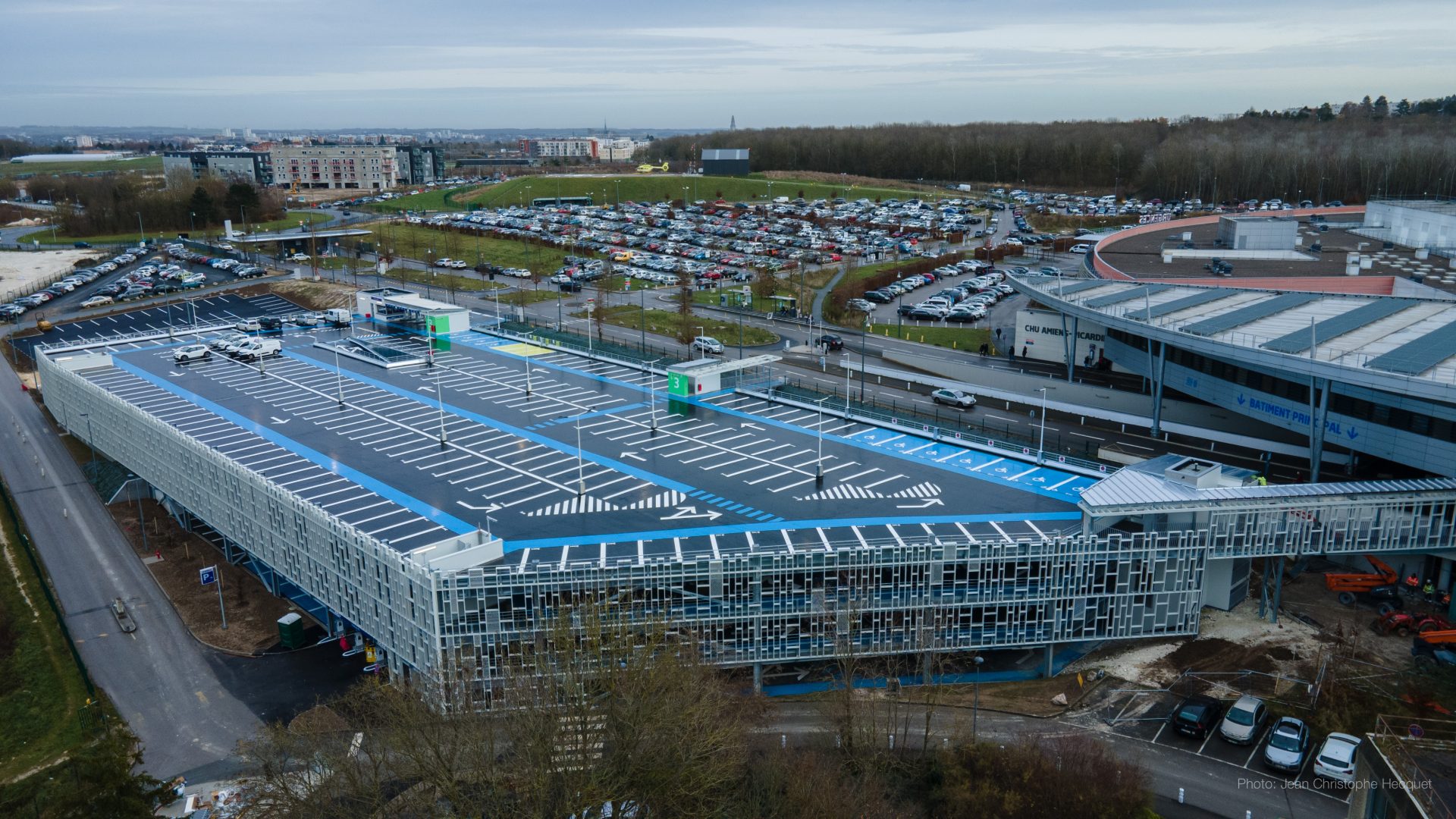 Quelques 896 nouvelles places de stationnement sur 4 étages ont ainsi été mises en services fin 2021. Une passerelle – accessible depuis chaque étage par un ascenseur – relie le parking à l’entrée principale du CHU.